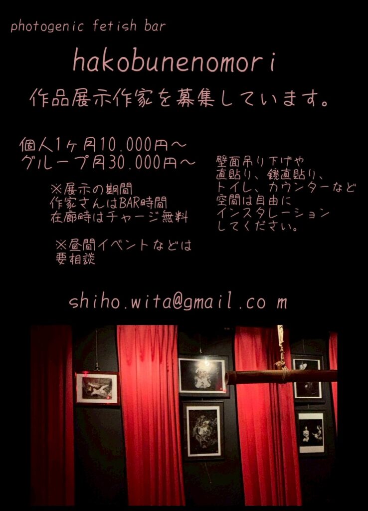 gallery出展募集 hakobunenomoriでは、表現をしたい作家さんを募集しています。 2025年は、この値段でやっていきますので、 出展してみたいアーティストさんは、是非。 営業時間外の18時までで イベントなど、したい方は、自由に遊んでください。 いろいろ楽しいフェチアートの輪が広がりますように。
